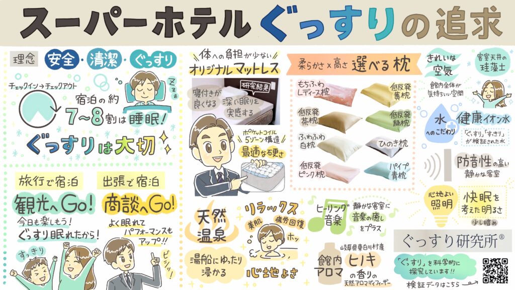 スーパーホテルは「ぐっすり眠れるホテル」をコンセプトにしてて、枕バーで自分に合った枕を選べたり、オーガニック寝具を使ってたり、全館禁煙(一部喫煙ルームあり)だったりと、睡眠の質にめちゃくちゃこだわっています!!